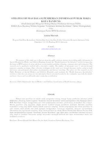 Tujuan dari penelitian ini adalah untuk mengetahui bagaimana strategi Humas Pemberian Informasi Publik Rumah Sakit Ibu Dan Anak Kota Bandung melalui kegiatan “Sosialisasi Jaminan Kesehatan” dalam meningkatkan citra rumah sakit dengan ditetapkan 4 mikro penelitian, yaitu pengumpulan informasi, perencanaan, komunikasi dan evaluasi. Metode penelitian yang digunakan adalah metode kualitatif dengan pendekatan deskriptif. Informan penelitian berjumlah 5 orang yang dipilih melalui Teknik purposive sampling. Teknik pengumpulan data dalam penelitian ini yaitu melalui studi pustaka dan studi lapangan, wawancara mendalam, observasi non-partisipan, dokumentasi, dan juga internet searching. Hasil penelitian yang didapatkan adalah proses Pengumpulan Informasi dimana terbagi dua yaitu dari pihak BPJS Kesehatan dan kebutuhan pasien. Proses Perencanaan yang dilakukan dengan mempersiapkan kegiatan dan menerapkan tujuan kegiatan. Proses Komunikasi dimana dilakukan secara langsung dan tidak langsung. Proses Evaluasi saat Humas Pemberian Informasi Publik RSKIA secara rutin mengevaluasi kegiatan “Sosialisasi Jaminan Kesehatan”. Kesimpulan dari penelitian Strategi Humas Pemberian Informasi Publik di RSKIA kota Bandung melalui kegiatan “Sosialisasi Jaminan Kesehatan” dapat meningkatkan citra rumah sakit di mata masyarakat dengan berlangsung kegiatan. Saran dari peneliti adalah Humas RSKIA dapat mempertahankan kegiatan “Sosialisasi Jaminan Kesehatan” agar dapat selalu memberikan informasi-informasi yang sangat di butuhkan masyarakat apalagi masyarakat menengah kebawah dan dapat menambahkan media seperti pancra indra saat melakukan sosialisasi.