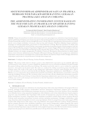 Tujuan dari penelitian ini adalah untuk merancang sistem agar pengawasan administrasi dapat berjalan dengan optimal, efektif dan terintegrasi serta merancang sistem untuk mempermudah proses keadministrasian di Kwartir Ranting Gerakan Pramuka Kecamatan Coblong (disingkat Kwarran Coblong). Metode yang digunakan dalam penelitian ini adalah metode survey dengan melakukan wawancara, observasi dan studi dokumen. Penelitian dilakukan dengan melakukan kunjungan ke Kwarran Coblong. Hasil dari penelitian ini adalah suatu sistem informasi administrasi satuan Pramuka yang mampu memberikan kemudahan kepada seluruh pengguna, baik dari pengurus Kwartir Ranting, pengurus Gugusdepan, Anggota Dewasa, ataupun Anggota Muda untuk mengakses informasi tentang administrasi di wilayah Kwartir Ranting Gerakan Pramuka Kecamatan Coblong. Adapun sistem informasi yang dibangun berbasis web dengan menggunakan CodeIgniter Framework. Kesimpulan dalam penelitian ini adalah dengan adanya sistem informasi administrasi satuan Pramuka di Kwarran Coblong, diharapkan proses pengawasan administrasi Gugusdepan yang berada di wilayah Kwarran Coblong dapat dikelola dan dipantau dengan mudah sehingga administrasi Gugusdepan yang berada di wilayah Kwarran Coblong tertata dengan rapi.