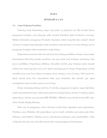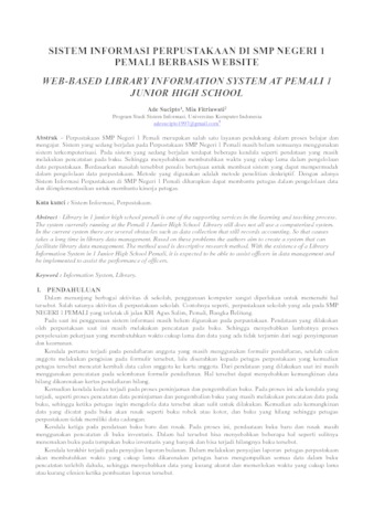 Perpustakaan merupakan salah satu layanan pendukung dalam proses belajar dan mengajar. Sistem yang sedang berjalan pada Perpustakaan SMP Negeri 1 Pemali masih belum semuanya menggunakan sistem terkomputerisasi, contohnya seperti peminjaman dan pengembalian buku. Untuk memaksimalkan proses pelayanan pada perpustakaan maka dibutuhkannya sebuah sistem informasi perpustakaan agar dapat membantu kinerja petugas perpustakaan. Tujuan dilakukannya penelitian ini adalah membangun sistem informasi perpustakaan yang dapat membantu petugas serta meningkatkan kinerja petugas dalam melayani para siswa/siswi SMP Negeri 1 Pemali. Metode yang digunakan adalah metode penelitian deskriptif. Teknik pengumpulan data yang dilakukan pada penelitian ini adalah observasi dan wawancara. Metode pengembangan menggunakan protorype. Metode pendekatan yang digunakan adalah terstruktur dengan alat bantu yaitu Flowmap, DFD (Data Flow Diagram), Kamus Data, ERD (Entity Relation Diagram), Diagram Konteks, dan normalisasi. Hasil dari penelitian ini menghasilkan sistem informasi perpustakaan di SMP Negeri 1 Pemali berbasis website. Dengan adanya Sistem Informasi Perpustakaan di SMP Negeri 1 Pemali diharapkan dapat membantu petugas dalam pengelolaan data dan diimplementasikan untuk membantu kinerja petugas.