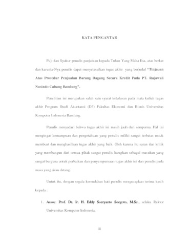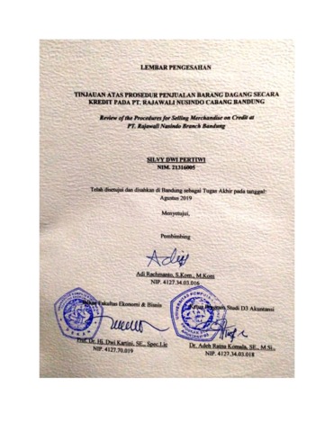 Pertiwi, Silvy Dwi (2019) Tinjauan Atas Prosedur Penjualan Barang Dagang Secara Kredit Pada Pt. Rajawali Nusindo Cabang Bandung. Diploma thesis, Universitas Komputer Indonesia.