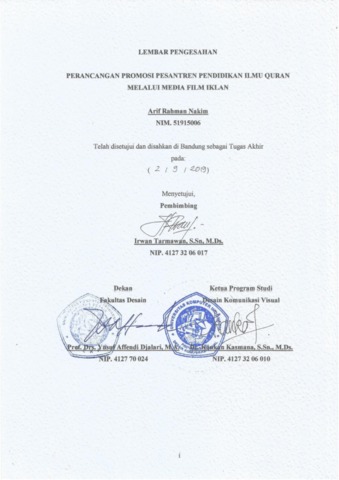 Nakim, Arif Rahman (2019) Perancangan Promosi Pesanten Pendidikan Ilmu Quran Melalui Media Film Iklan. Other thesis, Universitas Komputer Indonesia.