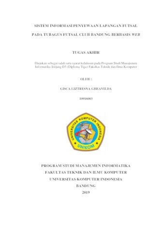Gheavilda, Gisca Liztresna (2019) Sistem Informasi Penyewaan Lapangan Futsal Pada Tubagus Futsal Club Berbasis Web. Diploma thesis, Universitas Komputer Indonesia.