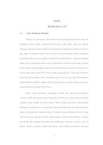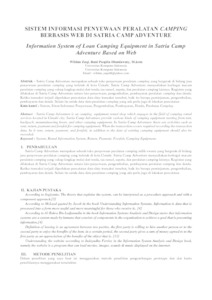 Satria Camp Adventure merupakan sebuah toko penyewaan peralatan camping yang bergerak di bidang jasa penyewaan peralatan camping yang terletak di kota Cimahi. Satria Camp Adventure menyediakan berbagai macam peralatan camping yang cukup lengkap mulai dari tenda, tas ransel, sepatu, dan peralatan camping lainnya. Kegiatan yang dilakukan di Satria Camp Adventure antara lain penyewaan, pengembalian, pembayaran peralatan camping dan denda. Sistem informasi penyewaan peralatan camping berbasis web merupakan sistem informasi yang berfungsi untuk meningkatkan kinerja yang terdapat di satria camp adventure. Sistem informasi ini dibuat untuk menciptakan fungsi yang terkomputerisasi yang mana bisa meminimalisir kesalahan diantaranya dalam pembuatan laporan, pengimputan data dan penyimpanan berkas. Dengan sistem ini, pelanggan dapat melakukan penyewaan secara online dengan mengakses web Satria Camp Adventure melalui internet. Metode penelitian yang digunakan yaitu metode penelitian desktiptif, yang mana dalam menggunakan metode penelitian deskriptif bertujuan untuk menggambarkan secara sistematis suatu fakta tertentu secara aktual dan teliti. Selain itu metode ini juga tidak sekadar menjabarkan analisa namun juga memadukan dari klasifikasi dan organisasi.