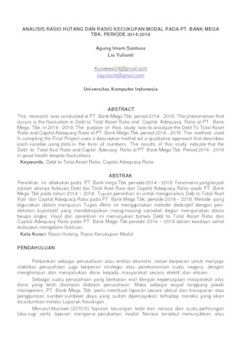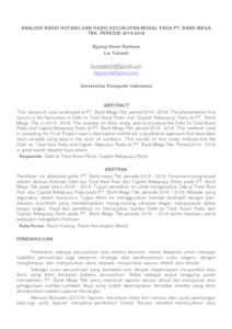 Penelitian ini dilakukan pada PT. Bank mega Tbk. periode 2014 – 2018. Fenomena yang terjadi adalah adanya fluktuasi Debt to Total Asset Ratio dan Capital Adequacy Ratio pada PT. Bank Mega Tbk. pada tahun 2014 – 2018. Tujuan penelitian ini untuk menganalisis Debt To Total Asset Ratio dan Capital Adequacy Ratio pada PT. Bank Mega Tbk. periode 2014 – 2018. Metode yang digunakan dalam menyusun Tugas Akhir ini menggunakan metode deskriptif dengan pendekatan kuantitatif yang mendeskripsikan masing-masing variabel dengan menggunakan data berupa angka. Hasil dari penelitian ini menunjukan bahwa Debt to Total Asset Ratio dan Capital Adequacy Ratio pada PT. Bank Mega Tbk.periode 2014 – 2018 dalam keadaan sehat walaupun mengalami fluktuasi.