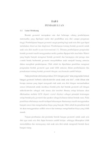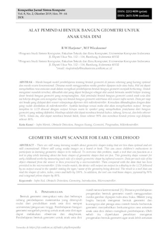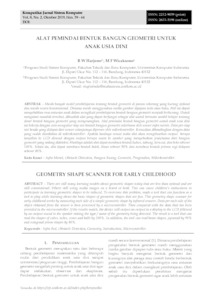 Masih banyak model pembelajaran tentang bentuk geometri di jaman sekarang yang kurang optimal dan masih secara konvensional. Dimana masih menggunakan media gambar dipapan tulis atau buku. Hal ini dapat menyebabkan rasa antusias anak dalam mengikuti pembelajaran bentuk bangun geometri menjadi berkurang. Untuk mengatasi masalah tersebut, dibuatlah alat yang dapat berfungsi sebagai alat untuk bermain sambil belajar tentang dasar bentuk bangun geometri yang menyenangkan. Alat pemindai bentuk bangun geometri untuk anak usia dini ini bekerja dengan cara mengukur tiap sisi bentuk bangun geometri sederhana oleh sensor infra merah. Data per-tiap sisi benda yang didapat dari sensor selanjutnya diproses oleh mikrokontroller. Kemudian dibandingkan dengan data yang sudah disediakan di mikrokontroller. Apabila hasilnya sesuai maka alat akan mengeluarkan output berupa tampilan ke LCD disusul dengan output berupa suara ke speaker yang menyebutkan jenis/nama dari bangun geometri yang sedang dideteksi. Hasilnya adalah alat dapat membaca bentuk kubus, tabung, kerucut, dan bola sebesar 100%. Selain itu, alat dapat membaca bentuk balok, limas sebesar 90% dan membaca bentuk prisma segi delapan sebesar 80%.