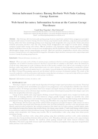 Garage kustom merupakan usaha yang bergelut di bidang otomotif khususnya sepeda motor. Ada beberapa aktivitas kerja yang belum optimal dalam penggunaan perangkat komputer salah satunya inventory barang yaitu, pada permintaan barang yang mana harus mendatangi gudang secara langsung untuk mengetahui stok yang tersedia. Semua pencatatan termasuk pencatatan purchase order dan retur barang masih menggunakan tulis tangan di secarik kertas, sehingga seringnya terjadi daftar barang sulit terbaca dan terjadinya kerusakan dokumen bahkan dapat terjadinya kehilangan dokumen.Metode penelitian yang digunakan adalah metode penelitian deskriptif dengan melakukan observasi dan wawancara, serta metode pendekatan yang digunakan adalah metode Object Oriented Programming (OOP) dan dikembangkan dengan metode pengembangan prototype. Hasil dari penelitian menghasilkan sebuah sistem informasi inventory barang berbasis web yang memiliki keunggulan yang diharapkan dapat membantu mempermudah dalam prosedur permintaan barang, prosedur purchase order, prosedur retur barang, serta diharapkan prosedur-prosedur yang ada bejalan lebih efektif dan efisien.