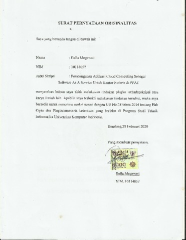 Megawati, Bella (2020) Pembangunan Aplikasi Cloud Computing Sebagai Software As A Service Untuk Kantor Notaris & PPAT. Other thesis, Universitas Komputer Indonesia.