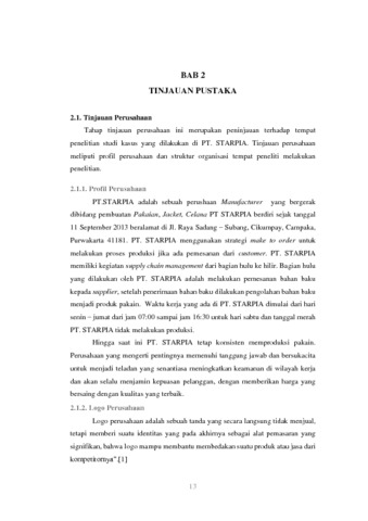 PT.STARPIA adalah sebuah perushaan Manufacturer yang bergerak dibidang pembuatan Pakaian, Jacket, Celana PT STARPIA berdiri sejak tanggal 11 September 2013 beralamat di Jl. Raya Sadang – Subang, Cikumpay, Campaka, Purwakarta 41181. PT. STARPIA menggunakan strategi make to order di mana strategi make to order dilakukan proses produksi jika ada pemesanan dari customer dan orderan khusus seperti jacket, baju, dan celana.. PT. STARPIA memiliki kegiatan supply chain management dari bagian hulu ke hilir. Bagian hulu yang dilakukan oleh PT. STARPIA adalah melakukan pemesanan bahan baku kepada supplier, setelah penerimaan bahan baku dilakukan pengolahan bahan baku menjadi produk pakain. Waktu kerja yang ada di PT. STARPIA dimulai dari hari senin – jumat dari jam 07:00 sampai jam 16:30 untuk hari sabtu dan tanggal merah PT. STARPIA tidak melakukan produksi. Solusi dari permasalahan diatas adalah dengan membangun sistem informasi supply chain management. Supply chain management merupakan serangkaian kegiatan yang meliputi koordinasi, penjadwalan dan pengendalian terhadap pengadaan, produksi, persediaan dan pengiriman produk. Hasil pengujian black box dan pengujian beta yang telah dilakukan, dapat disimpulkan bahwa sistem yang dibangun dapat diterima pengguna dan berfungsi dengan baik