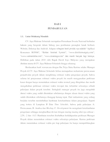 CV. Jaya Makmur Solusindo merupakan perusahaan swasta nasional berbadan hukum yang bergerak dalam bidang jasa pembuatan perangkat lunak berbasis website, desktop dan android. Pada saat pengerjaan proyek mengalami keterlambatan dalam hal penyelesaian proyek dikarenakan beberapa faktor yaitu Dalam menentukan estimasi waktu pekerjaan, penentuan estimasi waktu pekerjaan sering kali mengalami ketidak sesuaian karena penentuan estimasi waktu masih menggunakan perkiraan kasar dan mengabaikan kemungkinan waktu optimis dan pesimis. Selain itu belum adanya sistem yang menghitung pekerjaan mana yang harus diprioritaskan atau tidak bisa ditunda dan pekerjaan yang bisa ditunda untuk beberapa waktu. Kemudian pembuatan perhitungan perencanaan penjadwalan proyek memerlukan waktu yang lama. Berdasarkan permasalahan yang terjadi saat ini maka dibutuhkan sistem informasi penjadwalan proyek di CV. Jaya Makmur Solusindo. Metode yang digunakan untuk menyelesaikan masalah ini menggunakan metode Programe Evaluation and Review Technique (PERT) untuk menghitung estimasi waktu yang tepat dan menentukkan jalur kritis dimana terdapat pekerjaan yang diprioritaskan atau tidak bisa ditunda. Berdasarkan hasil pengujian yang dicapai, sistem informasi penjadwalan proyek sudah mampu mengatasi masalah yang terdapat di perusahaan yaitu, menghitung estimasi waktu yang tepat, memberikan informasi mengenai jalur kritis dan membuat jadwal dalam bentuk Gantt Chart.