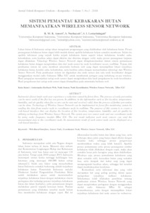 Kebakaran hutan merupakan salah satu masalah yang mengakibatkan hutan Indonesia semakin berkurang. Proses penanganan kebakaran hutan dapat lebih mudah diatasi apabila kebakaran belum semakin membesar. Selain itu apabila informasi yang terjadi ketika terjadi kebakaran hutan seperti lokasi kebakaran, kondisi suhu, kelembaban, serta kualitas udara dapat dikirim dan diterima dengan valid, maka proses penanganan lanjutan dapat dilakukan. Teknologi Wireless Sensor Network dapat diimplementasikan dalam sistem pemantauan kebakaran hutan dengan mengirimkan data dari node sensor ke node koordinator secara realltime. Tujuan dari pembuatan sistem ini yaitu membuat antarmuka berbasis web yang dapat menampilkan lokasi terjadinya kebakaran hutan, kondisi suhu, kelembaban, serta kualitas udara dengan memanfaatkan teknologi dari Wireless Sensor Network. Pada pembuatan sistem ini digunakan dua node sensor dan satu node koordinator dengan menggunakan modul radio frekuensi XBee S2C untuk membentuk jaringan yang terhubung secara wireless. Hasil pengujian menunjukan setiap node sensor dapat mengirimkan data hasil pengukuran ke node koordinator. Hasil pengukuran dari setiap node sensor dapat ditampilkan pada antarmuka berbasis web.