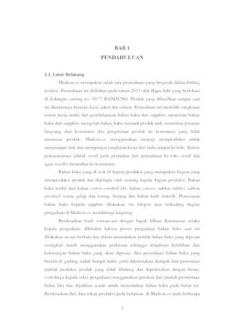 Madson.Co adalah perusahaan yang bergerak dalam bidang fashion yang berlokasi di jl.dungus cariang no. 49/77 BANDUNG. Madson.Co dalam melakukan pengadaan bahan baku ke supplier seringkali mengalami kesulitan dikarenakan ketidakpastian permintaan produk dari konsumen/ pelanggan. Permasalahan lainnya yaitu dalam menentukan jumlah bahan baku yang dipesan seringkali masih menggunakan perkiraan sehingga terjadinya kelebihan dan kekurangan bahan baku yang akan dipesan yang dapat mengakibatkan proses produksi terhambat. Penelitian ini bertujuan untuk pembangunan sistem informasi manajemen yang memungkinkan perusahaan agar lebih mudah mengelola pengadaan bahan baku. Metode peramalan yang digunakan untuk memperkirakan jumlah permintaan produk yaitu metode peramalan Single Exponential Smoothing dan MSE(Mean Square Error) untuk menentukan nilai alpha. Sehingga didapat hasil nilai alpha yaitu 0.9 dan untuk peramalan produk bulan januari 2019 sebanyak 225 buah produk yang harus diproduksi, dengan demikian dapat dihitung jumlah bahan baku yang harus dibeli oleh bagian pengadaan dengan menggunakan hasil permalan dikalikan dengan BoM(Bill of Material). Berdasarkan hasil pengujian blackbox dan wawancara terhadap setiap bagian di perusahaan dapat disimpulkan bahwa sistem ini bisa membantu perusahaan dalam memperkirakan jumlah bahan baku yang harus dibeli ke supplier dan membantu dalam proses produksi sehingga tidak terjadi kendala dalam pengiriman ke setiap konsumen.