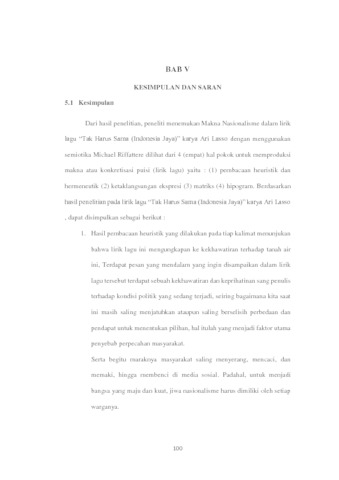 Penelitian ini merupakan penelitian kualitatif dengan menggunakan analisis semiotika Michael Riffaterre. Analisis dilakukan dengan membagi objek penelitian menjadi beberapa bait, yang kemudian dibedah berdasarkan teori pendekatan Riffaterre melalui pembacaan heuristik, hermeneutik, matriks dan hipogram. Hasil penelitian ini menunjukan bahwa lirik lagu ini mengungkapkan keprihatinan dan kekhawatiran terhadapat masyarakat. Seharusnya masyarakat memiliki kesadaran sebagai satu bangsa, yang dapat memperkuat rasa kebangsaan, persatuan dan kesatuan. Jiwa semangat dan nilai-nilai patriotik yang berkaitan dengan perasaan cinta tanah air, cinta kepada tanah tumpah darah, cinta kepada negara dan bangsa, cinta kepada milik budaya bangsa sendiri serta kerelaan untuk membela tanah airnya. Kesimpulan yang didapat dari penelitian ini adalah bahwa makna nasionalisme yang terkandung dalam lirik lagu ini dapat dilihat melalui pembacaan heuristik, hermeneutik, matriks dan hipogram dengan membagi beberapa bait lirik kemudian menghasilkan makna nasionalisme. Saran untuk peneliti selanjutnya dapat menggunakan metode lain untuk menganalisis lirik lagu seperti analisis roland barthes.