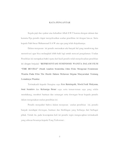 Penelitian ini bertujuan untuk menjelaskan secara rinci mengenai Representasi Feminisme Wanita Dalam Film The Hustle. Fokus masalah dalam penelitian ini terbagi menjadi ke dala.m sub-sub masalah mikro yaitu Representasi, Realitas dan Ideologi Feminisme Dalam Film The Hustle.