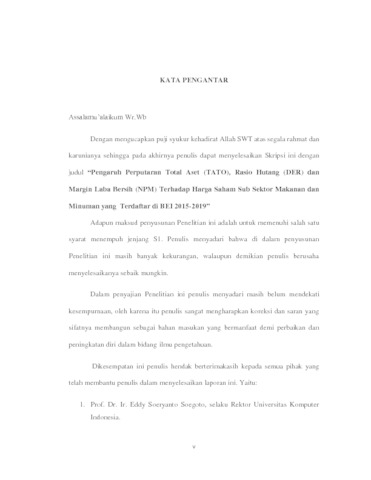 Penelitian ini bertujuan untuk mengetahui besarnya Pengaruh Perputaran Total Aset (TATO),Rasio Hutang (DER) Dan Margin Laba Bersih (NPM) Terhadap Harga Saham Pada Perusahaan Sub Sektor Makanan Dan Minuman Yang Terdaftar Di Bursa Efek Indonesia periode 2015-2019 baik secara simultan maupun secara parsial. Metode yang digunakan dalam penelitian ini adalah metode deskriptif dan verifikatif. Sedangkan data yang digunakan adalah data sekunder meliputi Perputaran Total Aset (TATO), Rasio Hutang (DER) Dan Margin Laba Bersih (NPM) Terhadap Harga Saham. Sampel menggunakan 30 pooled data perusahaan sub sektor makanan dan minuman dengan teknik metode purposive sampling sedangkan Pengujian statistika yang digunakan adalah analisis regresi linear berganda, asumsi klasik, koefisien korelasi, koefisien determinasi dan uji hipotesis dengan Uji-t dan Uji-f.