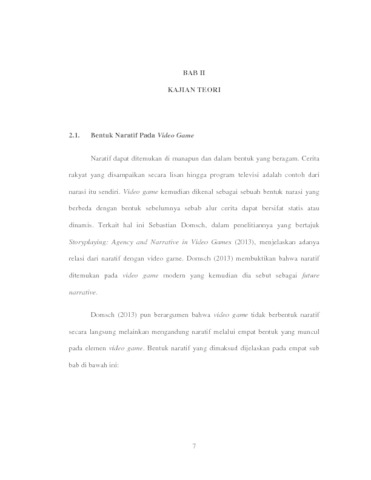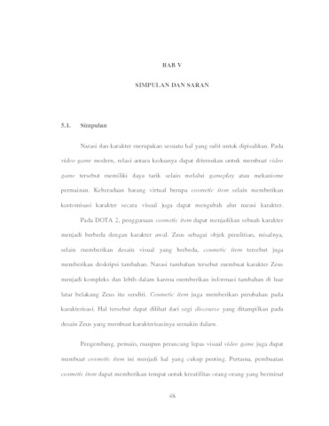 Video game modern memberikan bermacam-macam variasi fitur pada pemain tidak hanya dengan mengembangkan dari segi gameplay atau sistem mekanik video game. Naratif juga mempunyai peran dalam membangun video game modern. Pada DOTA 2, naratif dapat ditemukan dalam berbagai aspek. Naratif muncul dalam asal usul cerita utama bagaimana ras pada DOTA 2 berperang, latar tempat peperangan, dan pada cerita latar belakang tiap karakter dan barang di DOTA 2. Maka dari itu, karena memberikan penambahan naratif pada cerita utama, cosmetic item yang pada awalnya berperan sebagai aksesoris kini berperan menjadi salah satu pemberi unsur naratif. Cosmetic item kelas atas mempunyai deskripsi tambahan yang dapat mengubah cerita atau bahkan memperdalam cerita. Zeus sendiri memiliki cosmetic item kelas atas yang bernama Tempest Helm of the Thundergod, yang tidak hanya mengubah keseluruhan penampilannya, namun juga memberikan informasi tambahan yang mempertegas karakternya. Hal ini selaras dengan apa yang dikemukakan Domsch tentang teori future narrative (2013). Domsch mengemukakan bahwa video game memiliki naratif dengan empat bentuk, passive forms, actively nodal forms, dynamic forms, dan digression. Cosmetic item di DOTA 2 dapat berbentuk passive maupun dynamic, karena hal tersebut memberikan alur naratif tambahan dalam bentuk exposition, dan jika diaktifkan akan memberikan efek visual yang muncul selama permainan berlangsung dalam bentuk timed events