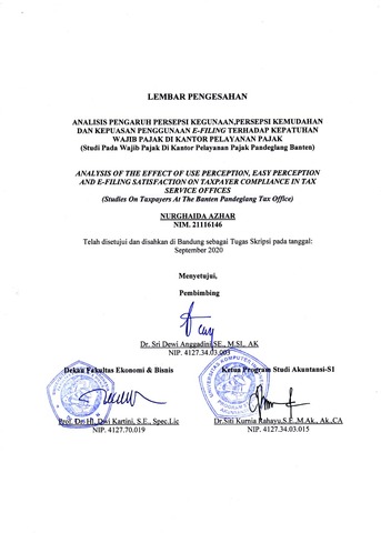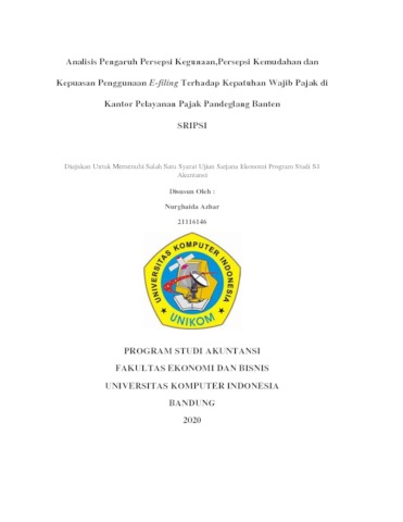 Azhar, Nurghaida (2020) Analisis Pengaruh Persepsi Kegunaan,Persepsi Kemudahan Dan Kepuasan Penggunaan E-Filing Terhadap Kepatuhan Wajib Pajak Di Kantor Pelayanan Pajak Pandeglang Banten. Other thesis, Universitas Komputer Indonesia.