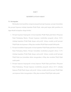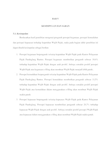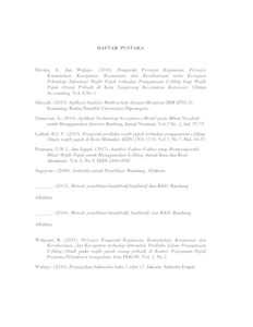 | Uncontrolled Keywords: | persepsi kegunaan, persepsi kemudahan, persepsi kepuasan, e-filing, kepatuhan wajib pajak. |