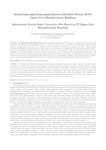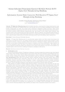 PT Sigma Steel Manufacturing adalah perusahaan yang bergerak di bidang industri karoseri yang memproduksi pembuatan tipe kendaraan mobil box, mobil bak dan micro bus. perusahaan menjalankan proses penjualan karoseri menggunakan job order yang dimana proses produksinya berdasarkan pesanan konsumen. Dalam proses pemesanan perusahaan menggunakan microsoft word dan microsoft excel sebagai media pencatatan pemesanan karoseri. hal tersebut berakibat kurang efektifnya pendistribusian data, oleh karena itu perlu adanya sistem informasi yang membantu dalam proses pendistribusian data dalam perusahaan.Dalam pembangunan sistem, penulis menggunakan metode pendekatakan berorientasi tersetruktur dan metode pengembangan prototype. Hasil dari penelitian ini, penulis membangun sistem informasi yang dapat mengintegrasikan divisi-divisi terkait dalam hal pemesanan karoseri sehingga menghemat tenaga serta memudahkan dalam menjalankan proses kerja.Dari hasil penelitian, penulis memberikan saran untuk dilakukan pengembangan dimana sistem dapat terintegrasi dengan divisi pembelian dan akunting agar sistem lebih sempurna sehingga proses kerja yang dilakukan pada perusahan telah sepenuhnya menggunakan sistem informasi, keuntungan dari proses kerja yang telah menggunakan sistem informasi adalah proses kerja yang lebih cepat dan menghemat tenaga dalam pendistribusian doukumen.
