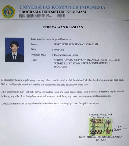 Hassabian, Gustiadhi Ariasenna (2018) Sistem Informasi Pemesanan Karoseri Berbasis Website Di PT Sigma Steel Manufacturing Bandung. Other thesis, Universitas Komputer Indonesia.