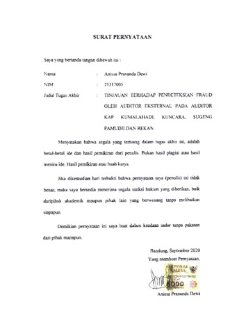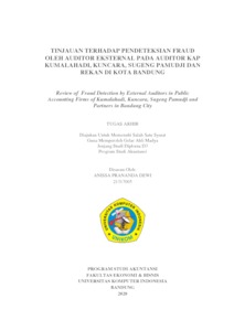 Dewi, Anissa Prananda (2020) Tinjauan Terhadap Pendeteksian Fraud Oleh Auditor Eksternal Pada Auditor Kap Kumalahadi, Kuncara, Sugeng Pamudji Dan Rekan Di Kota Bandung. Diploma thesis, Universitas Komputer Indonesia.