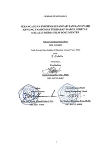 Makalah ini membahas tentang perancangan informasi dampak tambang pasir di kaki Gunung Tampomas Kabupaten Sumedang terhadap warga sekitar menggunakan media film berjenis dokumenter. Seiring dengan berlalunya waktu, penggalian pasir di Gunung Tampomas yang sudah dilakukan sejak tahun 1984 untuk dikirim ke luar kota dan dijadikan bahan bangunan, kondisinya sudah mengkhawatirkan, terlebih tambang pasir tersebut sudah mendekati pemukiman warga, sehingga berpeluang minimbulkan dampak yang mengganggu warga. Namun disamping dari pelbagai dampak negatif yang ada, justru aktivitas tambang pasir ini terus dilakukan karena memberi dampak positif berupa lapangan kerja bagi warga sekitar. Film dokumeter dipilih sebagai media utama dalam perancangan karena media tersebut dapat mendukung tujuan dari perancangan sendiri yaitu agar para komunikan mendapatkan informasi yang jelas dan sesuai dengan realita, selain itu informasi ini diharapkan bisa menumbuhkan kepedulian orang-orang terhadap keadaan alam di sekitarnya.