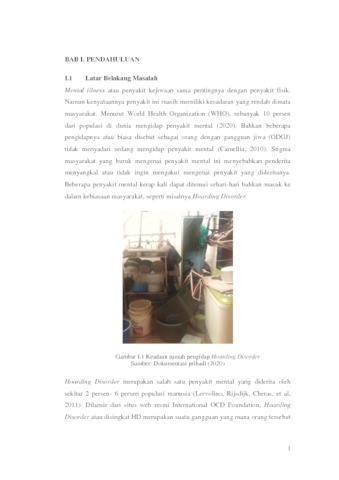Hoarding Disorder merupakan suatu penyakit mental saat penderitanya gemar menimbun barang-barang dan tidak ingin membuangnya walaupun bagi orang lain barang tersebut tidak memiliki nilai. Perilaku ini berdampak negatif terhadap lingkungan, kesehatan bahkan sampai psikologi, baik kepada pelaku atau penderita sampai kepada orang-orang sekitar. Melalui penelitian sebelumnya, didapatkan hasil bahwa meskipun istilah Hoarding Disorder tidak banyak diketahui oleh masyarakat luas, namun perilaku atau kebiasaan menimbun barang melekat erat di masyarakat. Kendati demikian, masyarakat melazimkan perilaku tersebut. Kekurang tahuan masyarakat terhadap hal ini akan membuat penderita semakin parah dan tidak terobati karena tidak mendapat pertolongan. Padahal gejala sudah mulai terlihat semenjak masa remaja. Masyarakat menganggap bahwa perilaku ini merupakah hal yang biasa dan bukan merupakan suatu gangguan. Dampak juga akan terasa bagi orang-orang yang tinggal bersama pengidap. Ruang gerak akan terbatas dan timbul masalah lingkungan serta masalah kesehatan. Untuk itu, dilakukan perancangan informasi mengenai Hoarding Disorder agar menambah wawasan dan informasi kepada masyarakat mengenai Hoarding Disorder. Hal ini dilakukan agar masyarakat dapat terhindar dari dampak yang ada dan tahu apa yang harus dilakukan terhadap pengidap sejak dini, yaitu sejak gejala awal mulai terlihat. Adapun media utama yang dirancang yaitu aplikasi interaktif yang terdapat informasi yang disajikan melalui cerita menarik namun juga interaktif sehingga informasi dapat tersampaikan kepada khalayak.