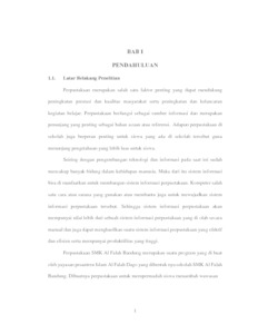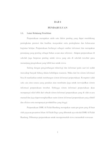SMK Al Falah Bandung merupakan salah satu komponen pendidikan dibawah naungan yayasan pesantren islam Al Falah dago. Semenjak SMK Al Falah Bandung berdiri selalu memberikan pelayanan pendidikan terbaik kepada masyarakat salah satunya dengan menyiapkan sarana perpustakaan yang representatif. Yang dimiliki oleh SMK Al Falah Bandung sampai sekarang perpustakaan Al Falah memiliki koleksi buku teks (BOS), buku pengayaan, buku referensi yang jumlahnya hampir sebanding dengan jumlah siswa. Perpustakaan SMK Al Falah Bandung sudah terdaftar di database perpustakaan nasional Indonesia.Perpustakaan SMK Al Falah Bandung masih menggunakan cara manual seperti pencatatan kegiatan yang ada di perpustakaan ke buku besar perpustakaan seperti pendaftaran kunjungan, peminjaman buku, pengembalian buku oleh karena itu, penulis merancang sebuah Sistem Informasi Perpustakaan SMK Al Falah Bandung yang dapat memudahkan siswa dan petugas perpustakaan. Dengan adanya Sistem Informasi Perpustakaan SMK Al Falah Bandung diharapkan dapat membantu pihak SMK AL Falah Bandung.Karena sistem perpustakaan pada SMK Al Falah Bandung tidak efektif maka penulis mengusulkan sistem informasi perpustakaan yang baru. Membuat kemudahan untuk siswa dan petugas perpustakaan dalam proses pengelolaan perpustakaan. Dengan judul “Sistem Informasi Perpustakaan di SMK Al Falah Bandung”.