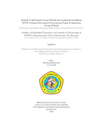 Rahmawati, Maulina (2020) Jumlah Wajib Pajak Orang Pribadi dan Jumlah Kepemilikan NPWP Sebagai Determinasi Penerimaan Pajak Penghasilan Orang Pribadi (Studi Kasus pada Kantor Pelayanan Pajak Pratama Soreang Periode 2015-2019). Other thesis, Universitas Komputer Indonesia.