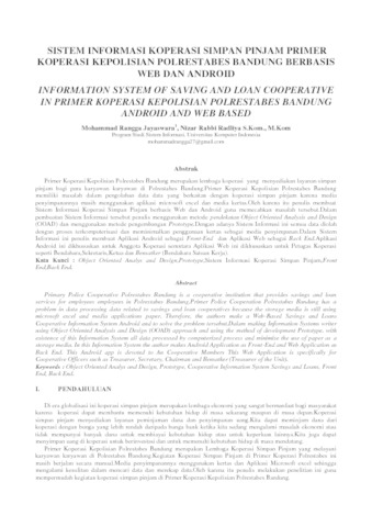 Primer Koperasi Kepolisian Polrestabes Bandung merupakan lembaga koperasi yang menyediakan layanan simpan pinjam bagi para karyawan karyawan di Polrestabes Bandung.Primer Koperasi Kepolisian Polrestabes Bandung memiliki masalah dalam pengolahan data data yang berkaitan dengan koperasi simpan pinjam karena media penyimpanannya masih menggunakan aplikasi microsoft excel dan media kertas sehingga sering terjadi penumpukkan dokumen dan menghambat aktivitas aktivitas yang berkaitan dengan koperasi simpan pinjam.Oleh karena itu penulis membuat Sistem Informasi Koperasi Simpan Pinjam berbasis Web dan Android guna memecahkan masalah tersebut.Dalam pembuatan Sistem Informasi tersebut penulis menggunakan metode pendekatan Object Oriented Analysis and Design (OOAD) dan menggunakan metode pengembangan Prototype.Dengan adanya Sistem Informasi ini semua data diolah dengan proses terkomputerisasi dan meminimalkan penggunaan kertas sebagai media penyimpanan.Dalam Sistem Informasi ini penulis membuat Aplikasi Android sebagai Front-End dan Aplikasi Web sebagai Back End.Aplikasi Android ini dikhususkan untuk Anggota Koperasi semntara Aplikasi Web ini dikhususkan untuk Petugas Koperasi seperti Bendahara,Sekretaris,Ketua dan Bensatker (Bendahara Satuan Kerja).