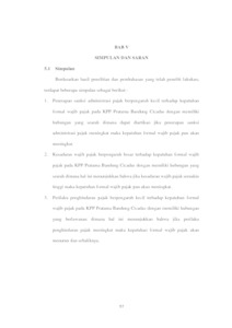 Hasil penelitian ini menunjukkan bahwa penerapan sanksi administrasi pajak dan kesadaran wajib pajak memiliki pengaruh positif terhadap kepatuhan formal wajib pajak. Sedangkan perilaku penghindaran pajak memiliki pengaruh negatif terhadap kepatuhan formal wajib pajak.