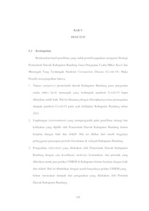 Dampak dari adanya pandemi Covid-19 di sektor UMKM mulai terasa dampaknya. UMKM di Kabupaten Bandung tidak sedikit yang mengalami penipisan bahan baku produksi, yang berakibat pada berhentinya produksi, ditambah dengan kurangnya pehamanan branding pruduk secara daring, dan mengakibatkan hilangnya pendapatan pelaku UMKM di Kabupaten Bandung. Tujuan dari penelitian ini untuk dapat mengetahui tujuan, lingkungan, pengarahan, tindakan, dan pembelajaran dalam strategi Pemerintah Daerah Kabupaten Bandung guna penguatan UMKM yang terdampak pandemi Covid-19. Adapun pada penelitian ini, peneliti menggunakan teori strategi pemerintah yang dikemukakan oleh Geoff Mulgan. Setidaknya ada lima komponen dalam menentukan strategi, di antaranya adalah: Purposes, Environments Directions, Actions, dan Learnings. Metode yang digunakan pada penelitian ini merupakan metode deskriptif dengan menggunakan pendekatan kualitatif. Teknik pengumpulan data pada penelitian ini menggunakan studi pustaka, wawancara, observasi, dan dokumentasi. Teknik untuk menentukan informan yang dipakai oleh peneliti adalah teknik purposive yang ditujukan kepada aparatur Bidang Perencanaan Pembangunan Koperasi, Usaha Mikro, Perdagangan, Industri dan ESDM Badan Perencanaan Pembangunan Kabupaten Bandung dan pelaku UMKM di Kabupaten Bandung yang terdampak pandemi Covid-19 dengan menggunakan teknik accidental. Adapun untuk teknik analisa data, peneliti menggunakan teknik analisis SWOT (Strength, Weakness, Opportunities, dan Threats). Dari hasil penelitian yang sudah dilakukan, menunjukan bahwa strategi yang dibuat oleh Pemerintah Daerah Kabupaten Bandung guna penguatan UMKM yang terdampak pandemi Covid-19 pada komponen Purposes, Environments Directions, Actions, dan Learnings sudah berjalan dengan baik, akan tetapi masih terdapat beberapa hal yang belum maksimal dalam implementasinya. Namun, dengan strategi yang digunakan oleh Pemerintah Daerah Kabupaten Bandung dapat berdampak bagi para pelaku UMKM dengan menguatnya usaha para pelaku UMKM yang terdampak pandemi Covid-19.