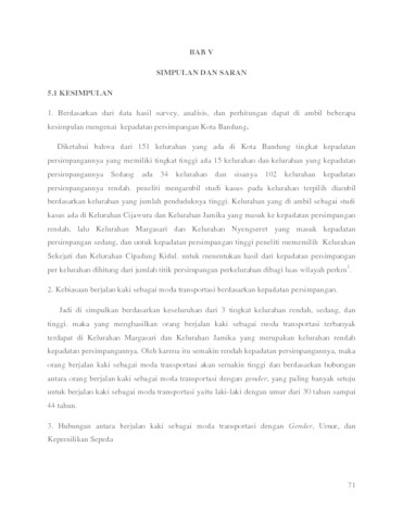Berdasarkan keseluruhan hasil data dari 3 Tingkat kelurahan (Rendah, Sedang, dan Tinggi). maka yang menghasilkan orang berjalan kaki sebagai moda transportasi terbanyak terdapat di Kelurahan Margasari dan Kelurahan jamika yang merupakan kelurahan Rendah Kepadatan Persimpangannya. Oleh karena itu semakin rendah kepadatan persimpangannya, maka keinginan orang berjalan kaki sebagai moda transportasi akan semakin tinggi. Serta berdasarkan hubungan antara orang berjalan kaki dengan Gender, yang paling banyak setuju untuk berjalan kaki sebagai moda transportasinya yaitu di dominasi oleh laki-laki.