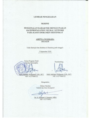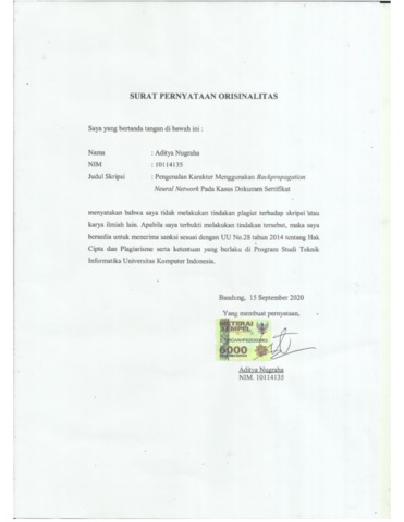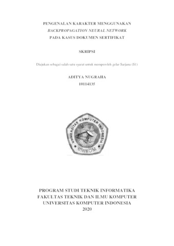 Nugraha, Aditya (2020) Pengenalan Karakter Menggunakan Backpropagation Neural Network Pada Kasus Dokumen Sertifikat. Other thesis, Univesitas Komputer Indonesia.