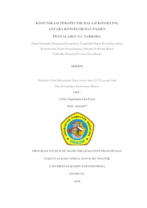 Tujuan penelitian ini adalah untuk mengetahui Komunikasi Terapeutik dalam Konseling antara Konselor dan Pasien Penyalahguna Narkoba. Untuk menjawab tujuan penelitian maka di tetapkan 4 sub fokus Peneliti, yaitu fase pra-interaksi, fase orientasi, fase kerja, dan fase terminasi Komunikasi Terapeutik Konselor dalam Merehabilitasi Pasien Penyalahguna Narkoba di Klinik Badan Narkotika Nasional Provinsi Jawa Barat. Penelitian ini menggunakan metode penelitian kualitatif dengan studi deskriptif. Jumlah informan pada penelitian ini adalah empat orang, yang terdiri dari tiga informan kunci dan satu informan pendukung. Teknik pengumpulan data yang digunakan dalam penelitian ini adalah studi pustaka, internet searching, wawancara mendalam, observasi non-partisipan dan dokumentasi.