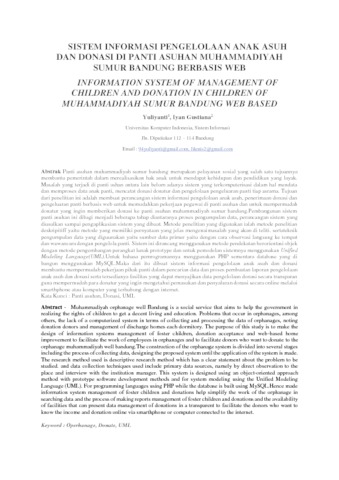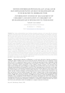 Panti asuhan muhammadiyah sumur bandung merupakan pelayanan sosial yang salah satu tujuannya membantu pemerintah dalam merealisasikan hak anak untuk mendapatkan penghidupan dan pendidikan yang layak. Masalah yang terjadi di panti ashan antara lain belum adanya sistem yang terkomputerisasi dalam hal mendata dan memproses data anak panti, mencatat donasi donatur dan pengelolaan pengeluaran panti tiap asrama. Tujuan dari penelitian ini adalah membuat perancangan sistem informasi pengelolaan anak asuh, penerimaan donasi dan pengeluaran panti berbasis web untuk memudahkan pekerjaan pegawai di panti asuhan dan untuk mempermudah donatur yang ingin memberikan donasi ke panti asuhan muhammadiyah sumur bandung.Pembangunan sistem panti asuhan ini dibagi menjadi beberapa tahap diantaranya proses pengumpulan data, perancangan sistem yang diusulkan sampai pengaplikasian sistem yang dibuat. Metode penelitian yang digunakan ialah metode penelitian deskriptif yang memiliki pernyataan yang jelas mengenai masalah yang akan diteliti. serta teknik pengumpulan data yang digunakan meliputi sumber data primer yaitu dengan cara observasi langsung ke tempat dan wawancara dengan pengelola panti. Sistem ini dirancang menggunakan metode pendekatan berorientasi objek dengan metode pengembangan perangkat lunak prototype dan untuk pemodelan sistemnya menggunakan Unified Modeling Language(UML).Untuk bahasa pemrogramannya menggunakan PHP sementara database yang di bangun menggunakan MySQL.Maka dari itu dibuat sistem informasi pengelolaan anak asuh dan donasi membantu mempermudah pekerjaan pihak panti dalam pencarian data dan proses pembuatan laporan pengelolaan anak asuh dan donasi serta tersedianya fasilitas yang dapat menyajikan data pengelolaan donasi secara transparan guna mempermudah para donatur yang ingin mengetahui pemasukan dan penyaluran donasi secara online melalui smarthphone atau komputer yang terhubung dengan internet.