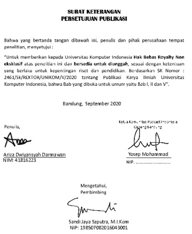19. UNIKOM_ARIZA DWIYANSYAH_SURAT KETERANGAN PERSETUJUAN PUBLIKASI.pdf - Published Version