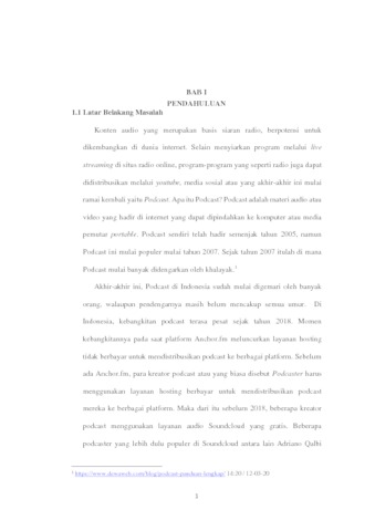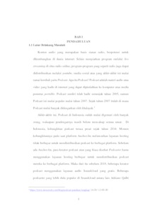 Podcast adalah audio atau video berisikan materi yang hadir di internet yang dapat dipindahkan ke komputer atau media pemutar portable. Podcast di Indonesia sudah mulai digemari oleh banyak orang, walaupun pendengarnya masih belum mencakup semua umur. Di Indonesia, kebangkitan podcast terasa pesat sejak tahun 2018. Dari sekian banyak komunitas yang hadir di Indonesia saat ini, peneliti tertarik untuk meneliti Komunitas Podcast Indonesia cabang Bandung.