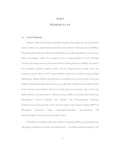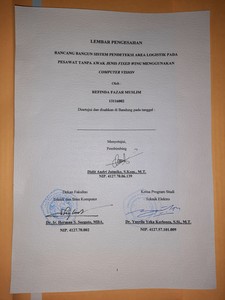 | Uncontrolled Keywords: | Kontes Robot Terbang Indonesia (KRTI) merupakan kompetisi rancang bangun pesawat tanpa awak yang diselenggarakan secara tahunan oleh Kementrian Riset dan Perguruan Tinggi (KEMENRISTEK). Salah satu kategori dari kompetisi ini adalah kategori fixed wing, kategori ini memiliki tema mapping and monitoring plantation area. Salah satu sub-misi dari kategori fixedwing ini adalah pemantauan. Pada misi pemantauan peserta diwajibkan mencari sebuah area logistik pupuk berupa terpal berbentuk persegi berwarna oranye dengan ukuran 2x2 m. Setelah sistem pendeteksi dapat menemukan area logistik, diharapkan wahana dapat mengitari area logistik guna mendapatkan hasil pengamatan citra yang lebih jelas. Oleh karena itu dilakukannya penelitian tentang cara membuat sistem pendeteksi area logistik dengan metode HSV dan wahana dapat mengitari area logistik dengan memberi perintah perubahan mode terbang dari autonomous waypoint ke mode mengitari (loiter). Berdasarkan data hasil percobaan dapat disimpulkan pada pengujian menggunakan software, sistem pendeteksi dapat menemukan area logistik dengan penambahan kecerahan hingga 40% dan pengurangan cahaya hingga 30% dalam satu parameter HSV. Sistem pendeteksian juga dapat mendeteksi area logistik dengan penambahan noise salt and pepper hingga 30% dari kerapatan piksel per frame. Perubahan mode terbang dari autonomous waypoint ke loiter tergantung pada hasil pendeteksian. Untuk pengujian dilapangan didapatkan hasil keberhasilan pendeteksian 100 % dari 5 kali percobaan dalam mendeteksi area logistik dan kemudian wahana dapat mengitari area logistik tersebut. Kata kunci : Autonomous, fixed wing, pengolahan citra, HSV. |