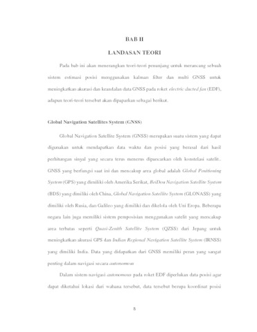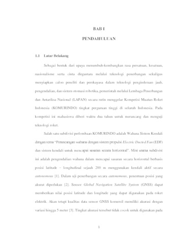 Kompetisi Muatan Roket Indonesia (KOMURINDO) merupakan kompetisi yang diselenggarakan oleh Lembaga Penerbangan dan Antariksa Nasional (LAPAN). Salah satu kategori pada kompetisi ini adalah Wahana Sistem Kendali, kategori ini memiliki tema “Perancangan wahana dengan sistem propulsi Electric Ducted Fan (EDF) dan sistem kendali untuk mencapai sasaran secara horizontal”. Pada Kategori ini setiap peserta diharuskan merancang wahana roket EDF yang dapat meluncur dari rel launcher secara autonomous menuju target selebar 25m sejauh 200m yang telah diketahui koordinat lokasinya. Oleh karena itu diperlukan sistem navigasi berbasis waypoint yang dapat mengarahkan wahana roket menuju target. Penelitian ini bertujuan untuk meningkatkan akurasi dan kepresisian data posisi dengan menggunakan algoritma Kalman Filter dan multi penerima GNSS untuk menestimasi posisi roket EDF. Pada penelitian ini digunakan dua buah penerima GNSS dengan jenis yang sama. Pengimplementasian sistem estimasi posisi ini mempertimbangkan tentang pengaruh berat terhadap titik center of gravity roket dan ukuran ruang payload. Pengujian sistem estimasi posisi dilakukan diarea terbuka dengan membawanya pada garis referensi yang telah diketahui nilai koordinatnya. Berdasarkan data hasil percobaan dapat disimpulkan bahwa sistem estimasi posisi ini mampu meningkatkan akurasi data sebesar 3 sampai 30%.