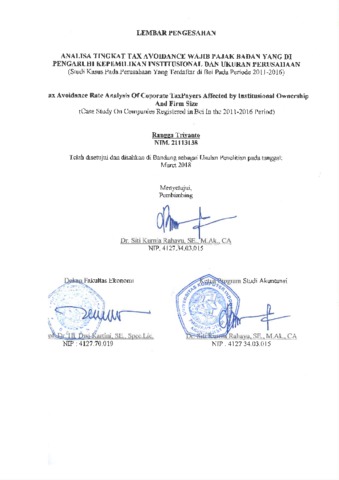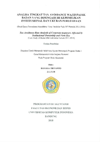 Triyanto, Rangga (2020) Analisa Tingkat Tax Advoidance Wajib Pajak Badan Yang Dipengaruhi Kepemilikan Institusional Dan Ukuran Perusahaan. Other thesis, Universitas Komputer Indonesia.