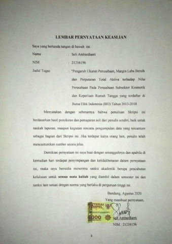 Ambardianti, Seli (2020) Pengaruh Ukuran Perusahaan, Margin Laba Bersih, Dan Perputaran Total Aktiva Terhadap Nilai Perusahaan Pada Perusahaan Subsektor Kosmetik Dan Keperluan Rumah Tangga Yang Terdaftar Di Bursa Efek Indonesia Pada Tahun 2013-2018. Other thesis, Universitas Komputer Indonesia.