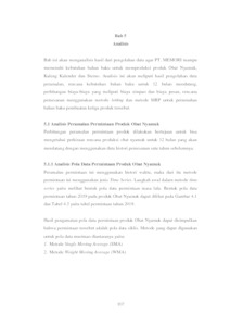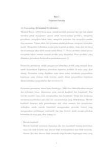 PT.MEMORI merupakan salah satu perusahaan yang bergerak dibidang perindustrian yang memproduksi barang-barang dengan menggunakan bahan baku kaleng. Cara pihak perusahaan dalam memenuhi kebutuhan hanya dengan cara melihat perkiraan sisa bahan baku yang ada di gudang, jika persediaan bahan baku di gudang sudah menipis pihak perusahaan akan melakukan pemesanan. Kurangnya pengetahuan dalam merencanakan strategi kebutuhan bahan baku yang membuat perusahaan ini tidak memiliki perencanaan dan penjadwalan persediaan kebutuhan bahan baku. Pentingnya bagi perusahaan memiliki strategi dalam melakukan perencanaan kebutuhan bahan baku, karena akan mempengaruhi kegiatan operasional dalam perusahaan. Selain itu juga bisa meminimasi biaya yang ditanggung perusahaan dalam penyediaan bahan baku. Strategi yang dapat digunakan perusahaan untuk merencanakan kebutuhan bahan baku adalah Material Requirement Planning (MRP) atau perencanaan pengendalian persediaan. Metode MRP mamiliki kemampuan untuk menciptakan harga yang lebih kompetitif, dapat meminimasi harga jual produk dan mengurangi tingkat persediaan. Strategi yang digunakan perusahaan akan mempengaruhi kualitas pelayanan kepada konsumen, sehingga mampu meningkatkan rasa kepercayaan konsumen terhadap perusahaan. Menggunakan metode MRP, perencanaan akan lebih terstruktur sehingga perusahaan bisa merespon lebih baik terhadap permintaan pasar, metode MRP juga mampu mengurangi biaya set-up dan waktu menganggur terhadap karyawan (idle time). Awal melakukan perhitungan forecasting dengan menggunakan metode time series pola data permintaan ketiga produk yaitu musiman dan siklis. Metode forecasting yang terpilih untuk produk obat nyamuk berdasarkan nilai MSE terkecil yaitu metode weight moving average dengan nilai MSE sebesar 24705654, produk kaleng kalender metode weight moving average nilai MSE sebesar 1850473677132 dan produk sterno metode single exponential smoothing nilai MSE sebesar 1003824. Perencanaan persediaan menggunakan 10 metode lotting yaitu metode Algoritma Wagner Within (AWW), Lot For Lot (LFL), Fixed Order Quantity (FOQ), Fixed Planning Requirements (FPR), Economic Order Quantity (EOQ), Periode Order Quantity (POQ), Least Unit Cost (LUC), Least Total Cost (LTC), Part Periode Balancing (PPB), Silver Meal (SM). Berdasarkan hasil dari perhitungan mendapatkan hasil akhir berupa total biaya kebutuhan persediaan yang paling rendah. Metode yang terpilih berdasarkan biaya yang paling rendah yaitu metode (LUC). ). Jenis data pada produk obat nyamuk adalah data probabilistik, dikarenakan harga yang digunakan adalah konstan, permintaan produk fluktuatif. Hasil total biaya dari 10 metode, total harga yang murah ada 6 metode dengan nilai yang sama yaitu Rp. 3.720.600 diantaranya metode AWW, LFL, LUC, LTC, PPB dan SM. Enam metode tersebut ada lima metode berjenis deterministik, tetapi metode LTC adalah jenis probabilistik. Maka dari itu metode yang terpilih sesuai dengan jenis data produk adalah metode LTC dengan total biaya sebesar Rp. 3.720.600 untuk satu periode. Jenis data pada produk kaleng kalender adalah deterministik dan dilihat dari hasil yang didapat dari 10 metode lotting, metode LFL yang terpilih dikarenakan mempunya total biaya yang termurah yaitu sebesar Rp. 40.549.092 untuk 12 bulan mendatang. Data sterno yang didapat dari perusahaan berjenis probabilistik (tidak konstan). Maka dari itu seharusnya harga yang termurah juga didapat dari metode lotting yang berjenis probabilistik. Berdasarkan tabel tersebut terlihat bahwa metode LTC mempunya nilai yang lebih rendah dibandingkan metode yang lainnya dan berjenis deterministik. Sehingga dari 10 metode tersebut yang terpilih adalah metode LTC dengan total biaya untuk 1 periode yang akan datang sebesar Rp.2.597.489.