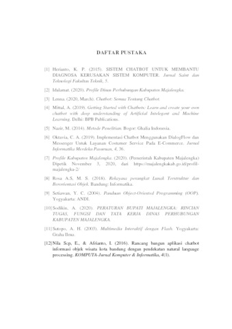 Syam, Egga Dinarul (2021) Implementasi Chatbot Sebagai Media Informasi Angkutan Umum Di Dinas Perhubungan Kabupaten Majalengka. Other thesis, Universitas Komputer Indonesia.