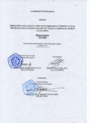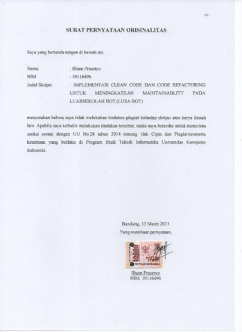 Prasetyo, Ilham (2021) Implementasi Clean Code Dan Code Refactoring Untuk Meningkatkan Maintainability Pada Luarsekolah Bot (Lusa Bot). Other thesis, Universitas Komputer Indonesia.