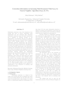 Ekstraksi informasi merupakan salah satu dari cabang text mining yang bertujuan untuk mengambil informasi dari teks yang tidak terstruktur menjadi data yang terstruktur. Ekstraksi informasi dokumen yang menggunakan klasifikasi rule-based memiliki masalah penurunan akurasi pada karakteristik dokumen yang tidak identik. Oleh karena itu, penelitian ini menggunakan machine learning Fuzzy K-Nearest Neighbour (Fuzzy K-NN) sebagai klasifikasi ekstraksi informasi dokumen. Dokumen yang digunakan dalam penelitian ini adalah surat masuk. Tujuan penelitian ini adalah untuk menganalisis bagaimana tingkat performa klasifikasi Fuzzy K-NN dalam ekstraksi informasi surat masuk yang memiliki karakteristik data tidak identik dan membandingkan tingkat akurasi dengan klasifikasi K-NN. Penelitian ini menggunakan praproses converting, filtering, tagging dan tokenization, serta menggunakan boolean weighting sebagai metode pembobotan. Ekstraksi fitur yang digunakan memiliki 11 parameter. Pengujian yang dilakukan menggunakan pengujian black box dan perhitungan akurasi dengan confusion matrix. Hasil analisis pengujian akurasi menunjukkan bahwa nilai akurasi klasifikasi Fuzzy K-NN lebih baik daripada klasifikasi K-NN dengan 87,52 % berbanding 85,17%. Berdasarkan hasil tersebut, disimpulkan algoritma Fuzzy K-NN dapat diterapkan menjadi klasifikasi dalam ekstraksi informasi dokumen surat masuk.