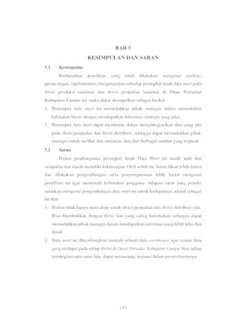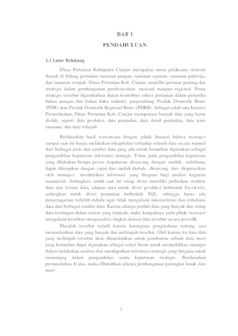 Dinas Pertanian Kabupaten Cianjur terutama pada divisi produksi tanaman dan divisi penjualan tanaman saat ini tidak dapat menyajikan informasi yang jelas bagi pihak manager ketika akan menentukan kebijakan bisnis, karena cara mendapatkan informasi saat hanya melakukan rekapitulasi terhadap seluruh data secara manual dari berbagai jenis dan sumber data yang ada untuk kemudian digunakan sebagai pengambilan keputusan informasi strategis. Selain itu, karena adanya perbedaan format data dari setiap divisi, kemudian masing-masing data tersimpan dalam sistem yang terpisah, data yang digunakan dalam penyajian sebuah informasi belum memiliki struktur data yang sama, sehingga harus ada penyeragaman terlebih dahulu agar tidak mengalami inkonsistensi dan redudansi data dari berbagai sumber data. Hal itu menyebabkan pihak manager kesulitan dalam menganalisis tingkat akurasi data tersebut secara periodik. Data mart adalah sub bagian dari sebuah Data warehouse yang hanya terfokus pada satu atau beberapa divisi saja, yang mana hasil dari data mart merupakan informasi hasil intisari dari sebuah diagram relasi, yakni informasi yang sudah dianalisis, di filter dengan menggunakan Online Analytical Processing (OLAP) berdasarkan keinginan dan kebutuhan dari manager. Hasil informasi yang disajikan berupa pivot grid, dan laporan yang terbentuk bisa dalam bentuk grafik visualisasi data. Pembangunan data mart ini, dapat mempermudah dan membantu pihak manager dalam menentukan kebijakan bisnis serta mendapatkan informasi strategis yang berguna untuk menunjang dalam pengambilan suatu keputusan yang strategis.