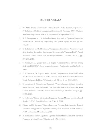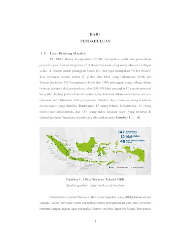 Dalam usaha bidang jasa layanan, suatu perusahaan pasti akan mengutamakan kualitas layanan bagi pelanggan-pelanggannya. PT. Mitra Buana Koorporindo (MBK) merupakan salah satu perusahaan yang bergerak dibidang jasa, dan menyediakan berbagai solusi IT. Salah satunya adalah layanan pemeliharaan (maintenance service) untuk perangkat IT. MBK mempekerjakan teknisi untuk memastikan perangkat yang termasuk manage service harus dalam performa terbaik atau berfungsi normal. Dalam pelaksanaannya, kualitas maintenance service tersebut ditentukan dari durasi penyelesaian setiap laporan kerusakan pada perangkat manage service-nya. Selain itu, semua yang terlibat dalam maintenance service seperti admin, teknisi dan pelanggan selalu mengharapkan kemudahan dalam prosesnya. Berdasarkan hasil analisa permasalahan, akan diterapkan system aplikasi maintenance service berbasis android. Teknologi yang digunakan diantaranya Barcode scanner, Location Base Services (LBS) dan QR-Code. Teknologi LBS ini mempunyai fungsi untuk menyimpan, dan mendistribusikan data dan informasi berdasarkan sistem koordinat geographic secara reall-time. Sedangkan Barcode Scanner dan QR-Code mempunyai fungsi untuk mempermudah proses pembacaan kode serta men-enkripsikannya.