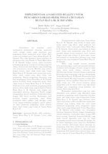 Penenelitian ini bertujuan untuk memaparkan pemanfaatan teknologi augmented reality sebagai media untuk membantu para pengunjung dalam mengetahui posisi lokasi objek wisata yang terdapat pada Taman Hutan Raya Ir. H. Djuanda. Data yang digunakan dalam penelitian ini merupakan data yang diambil di Taman Hutan Raya Ir. H. Djuanda dengan metode seperti kuesioner terhadap pengunjung, wawancara terhadap pengelola tahura, observasi dan studi literatur yang mendukung teori penyelesaian masalah. Masalah yang muncul dengan luasnya lokasi objek wisata pada Taman Hutan Raya Ir. H. Djuanda salah satunya yaitu posisi lokasi objek wisata yang akan dituju oleh pengunjung. Banyak pengunjung khususnya yang baru mengunjungi Taman Hutan Raya Ir. H. Djuanda merasa kesulitan dalam mengetahui posisi lokasi objek wisata di Taman Hutan Raya Ir. H. Djuanda. Salah satu solusi untuk membantu pengunjung dalam mencari lokasi objek wisata yang terdapat di Taman Hutan Raya Ir. H. Djuanda yaitu dengan cara menerapkan teknologi Augmented Reality dengan menggunakan metode markerless berdasarkan lokasi dengan GPS based tracking. Berdasarkan hasil kuesioner kepada pengunjung, dapat ditarik kesimpulan bahwa aplikasi yang dibangun sudah sesuai dengan kebutuhan pengguna seperti aplikasi ini dapat membantu pengunjung dalam mencari lokasi objek wisata yang berada di Taman Hutan Raya Ir. H.
