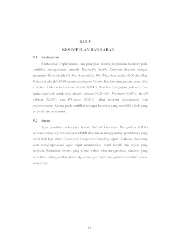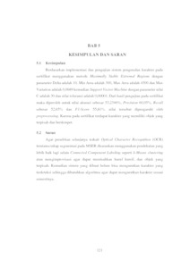 Optical Character Recognition (OCR) merupakan citra yang dapat dikenali oleh komputer dalam proses konversi menjadi karakter ASCII. Citra bisa berupa hasil print-screen, hasil dokumen yang telah di scan, hasil foto dan lain sebagainya. Pada penelitian ini dokumen yang digunakan adalah dokumen sertifikat yang telah di scan. Karena pada sertifikat terdapat huruf yang berbagai macam jenis. Pada penelitian ini metode segmentasi yang digunakan adalah Maximally Stable Extremal Regions, sedangkan untuk klasifikasi digunakan Support Vector Machine. Sebelum masuk kedalam tahap klasifikasi, citra akan melalui tahap preprocessing yang terdiri dari grayscale, proses Maximally Stable Extremal Regions, serta resize atau resize. Dimana MSER akan mendeteksi teks dan bukan teks pada sertifikat seperti memisahkan karakter huruf dan angka dengan logo atau tanda tangan dan lain-lain. Pada penelitian ini karakter yang akan dikenali adalah 62 karakter atau kelas yang terdiri dari 0-9, A-Z, a-z. Sampel yang digunakan untuk data training pada tiap kelasnya adalah 120 data kemudian ditambah dengan beberapa sampel dari data uji. Kemudian sampel yang digunakan untuk data uji adalah 20 sertifikat. Berdasarkan hasil pengujian yang dilakukan, maka didapatkan rata-rata akurasi terbaik sebesar 53,2346%, Precision 60,05%, Recall sebesar 52,65% dan F1-Score 55,81%. hasil tersebut dipengaruhi oleh preprocessing. Karena pada sertifikat terdapat karakter yang memiliki objek yang terpisah dan berdempet.