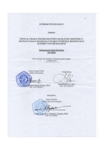| Uncontrolled Keywords: | Optical Character Recognition, Sertifikat, Maximally Stable Extremal Regions, Support Vector Machine, preprocessing. |